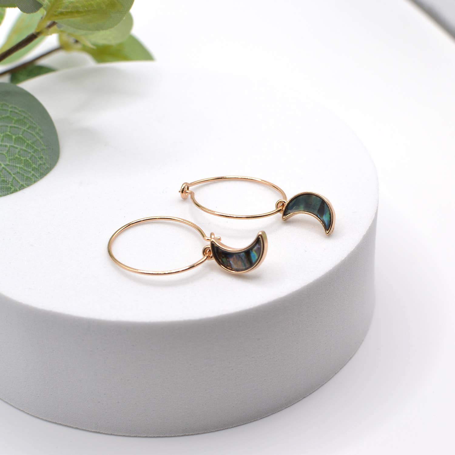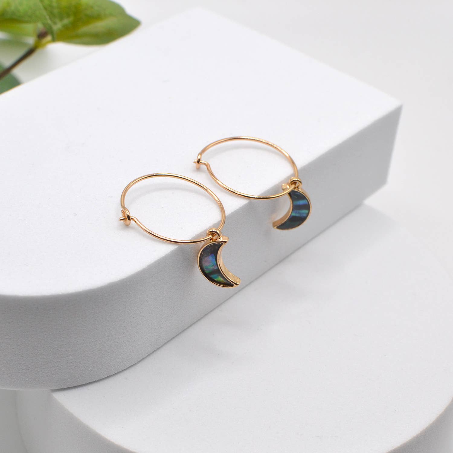 Delicate gold-tone hoops paired with dainty crescent moon charms, each embedded with abalone shell that reflects light with hues of blue, green, and purple. Lightweight and stylish, perfect for everyday wear or moonlit nights out.