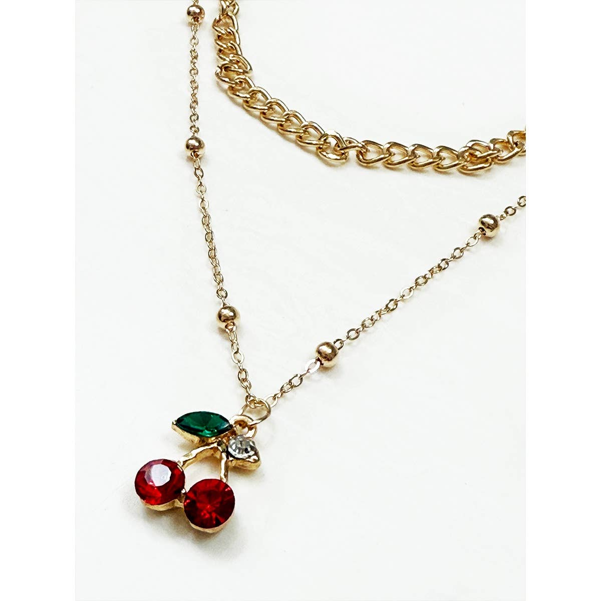 đ Sweet, sassy, and just the right touch of glam! This Cherry Charm Layered Necklace features a trendy two-in-one design with a bold gold chain and a delicate beaded strand. The playful cherry pendant with sparkling red and green gems adds a fun pop of colorâperfect for summer fits, flirty nights out, or everyday styling.