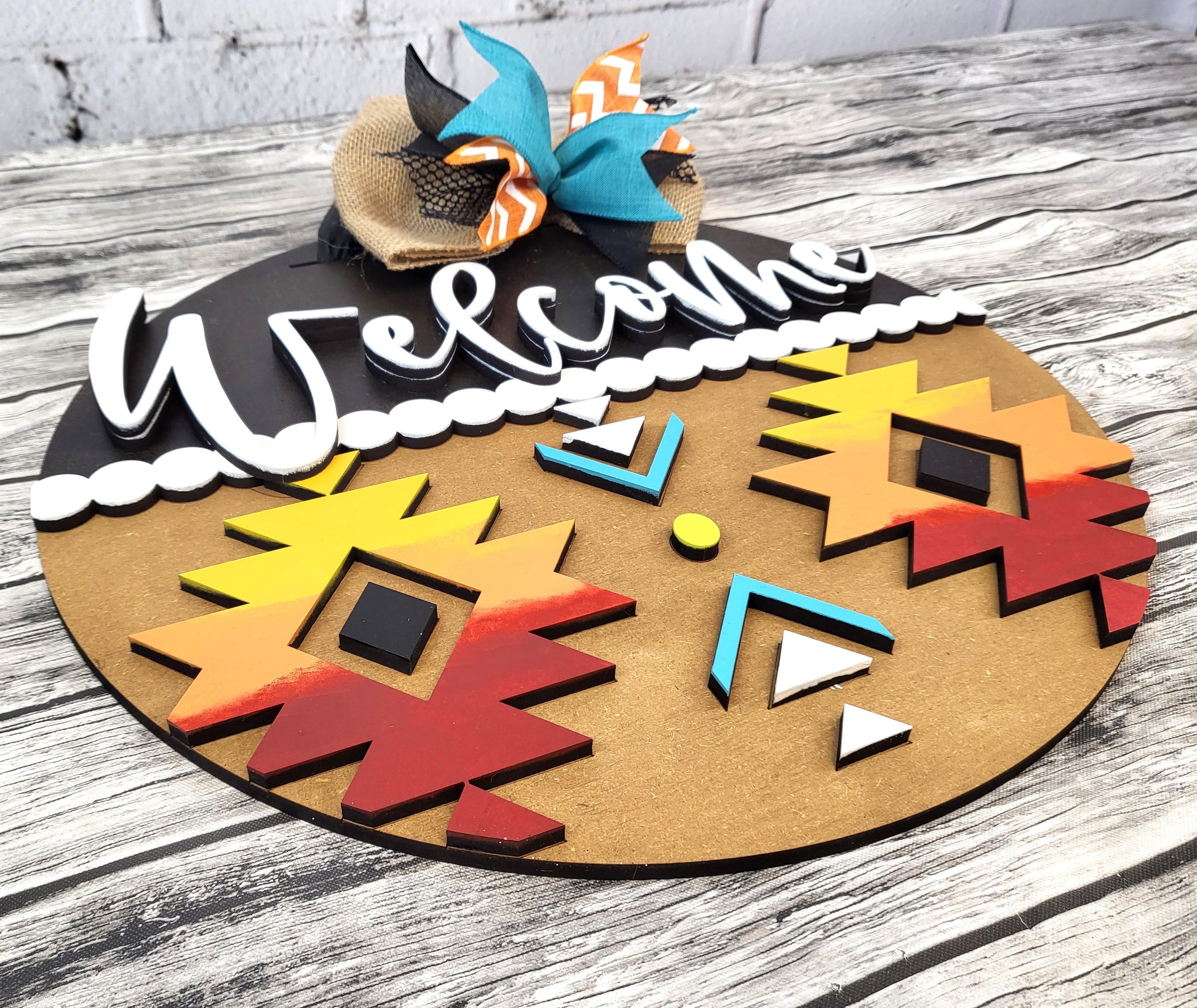 Welcome Aztec hand painted door hanger! 3D 1/4" MDF on an 16" White Round Door Hanger with coordinating ribbon hanger and accent bow!